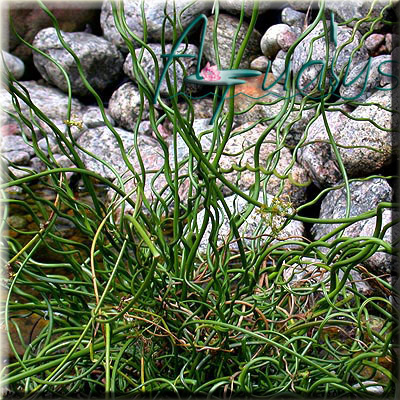 JUNCUS EFFUSUS SPIRALIS Jonc épars en spirale Corkscrew rush Le vrai jonc en spirale. Feuillage vert finement frisé, 30-45 cm (12"-18") de hauteur. Comme la précédente, cette plante est spectaculaire aux abords du bassin.