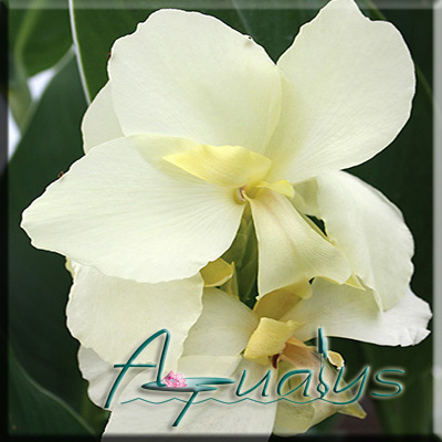 CANNA ERMINE Canna hermine Canna ermine Le plus près du blanc dans la famille des cannas. Ce feuillage d'environ 90 cm (36'') est surmonté tout l'été de belles grosses fleurs blanc cassé avec un peu de jaune pâle vers le centre.